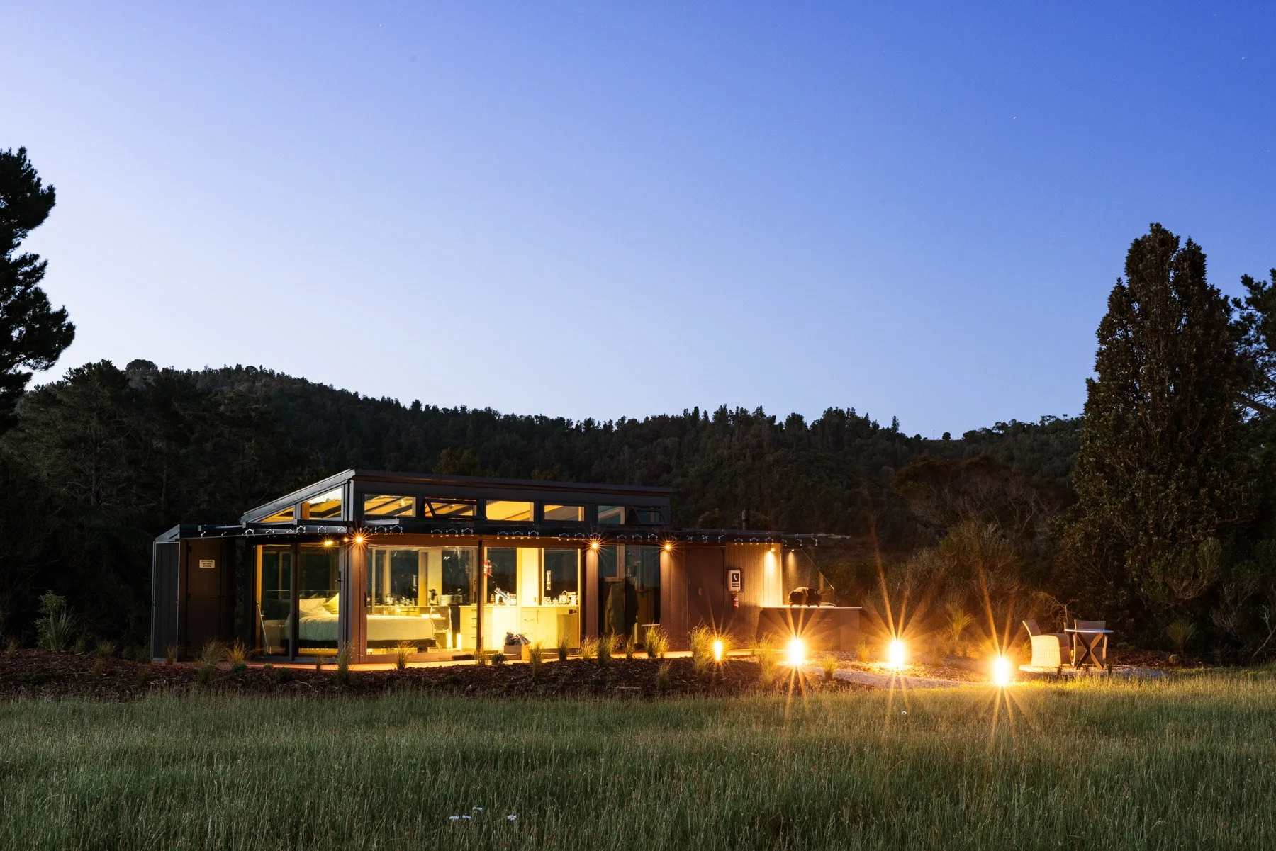 The pod interior has a combination of aluminium joinery and wooden detailing. Every glass wall is a framed outlook of green or blue. Solar panels power the house lights. Gas heats the water and powers the hob. Not a power line in sight.